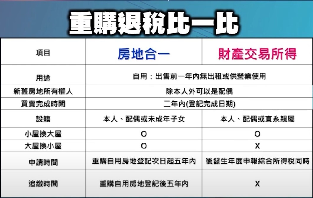 不管你是先買新屋後賣舊屋 還是 先賣舊屋後買新屋 ,都要在兩年內完成買賣流程(已登記日為主),再來你要申請重購退稅用你自用的那間要去辦理時記得! 5年內要去辦理喔,再來 政府依照流程都退給你稅款了,你如果5年內又把自用這間賣掉!那不好意思,錢還來!!!給政府!!!,所以阿再怎樣不想把錢還回去都要撐到6年之後就不會有這種問題了。